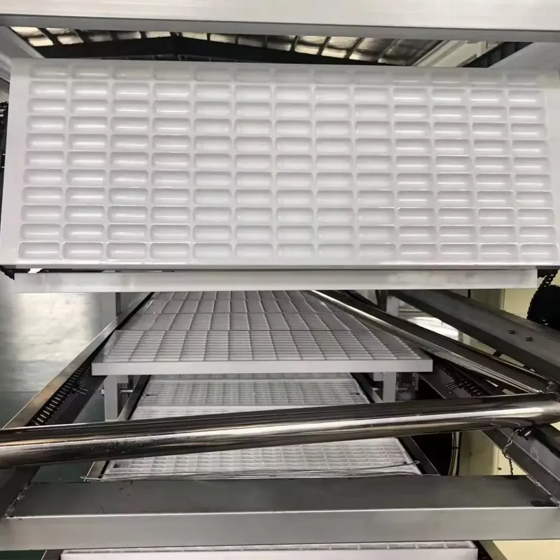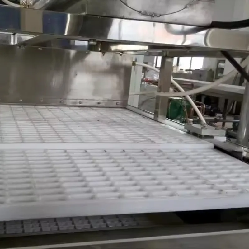 7. Автоматическое распределение и подача массы, автоматическое выравнивание, охлаждение и извлечение из форм. Высокая производительность и эффективность без необходимости ручного труда.